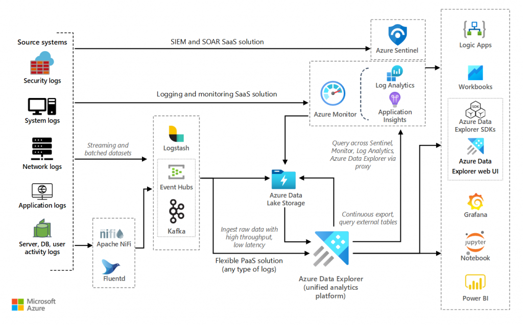 Use Azure Data Explorer in a hybrid monitoring solution that includes Microsoft Sentinel and Azure Monitor to ingest streamed and batched logs from diverse sources.