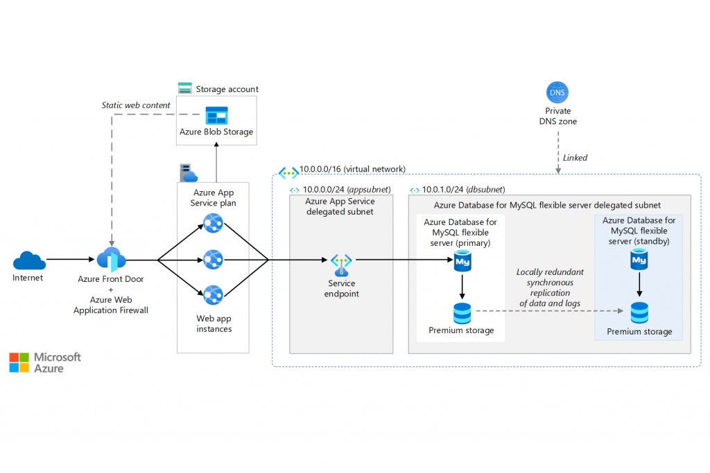 Use Azure Front Door, Azure App Service, and other Azure services to deploy a highly scalable and secure installation of WordPress.